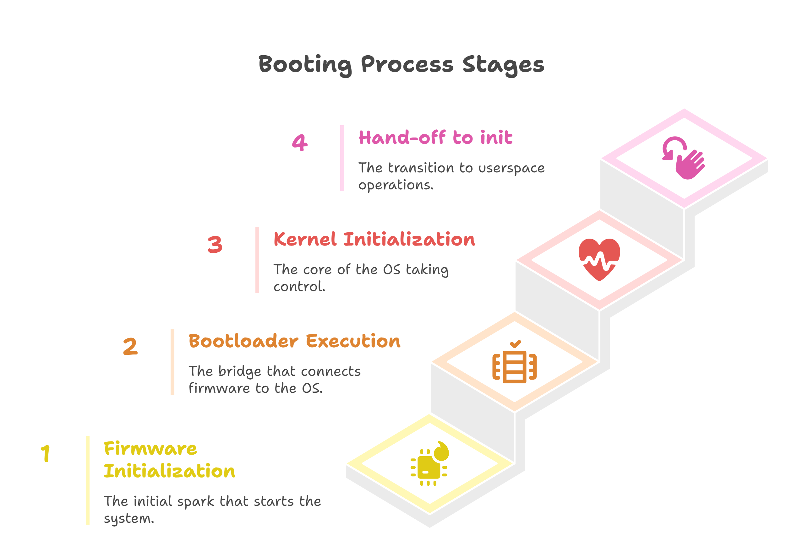 At its core, booting is a procedure that takes a system from inert hardware to a fully operational state. This happens across four fundamental stages, each building upon the last.